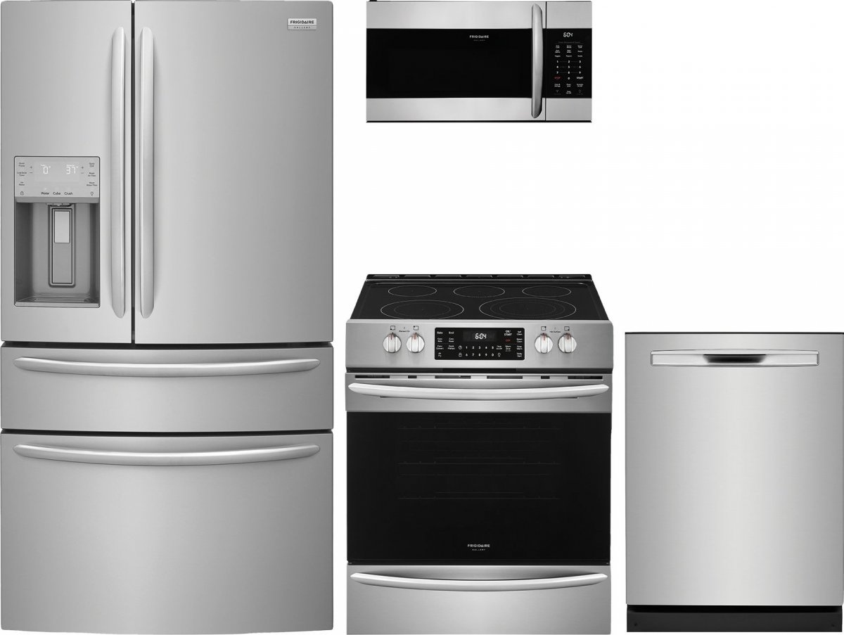 Frigidaire Gallery® 4 Piece Stainless Steel Kitchen Package with a French door refrigerator, freestanding electric range with air fry, over the range microwave, and built in dishwasher.Read More