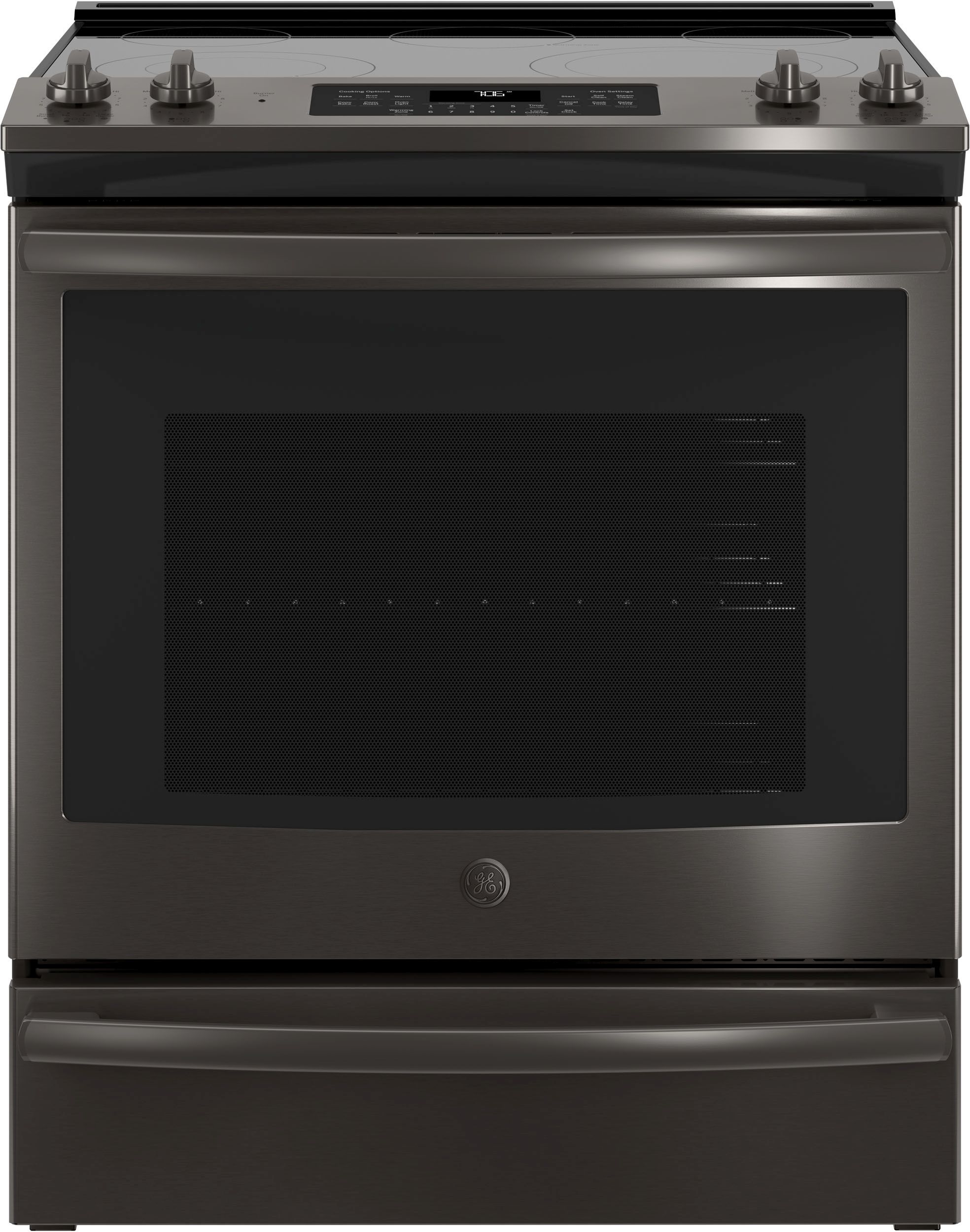 GE® 30" Slide In Electric Convection Range-Black Stainless with 5.3 cu. ft. total capacity, 5 burners and a black ceramic glass cooktop surfaceRead More