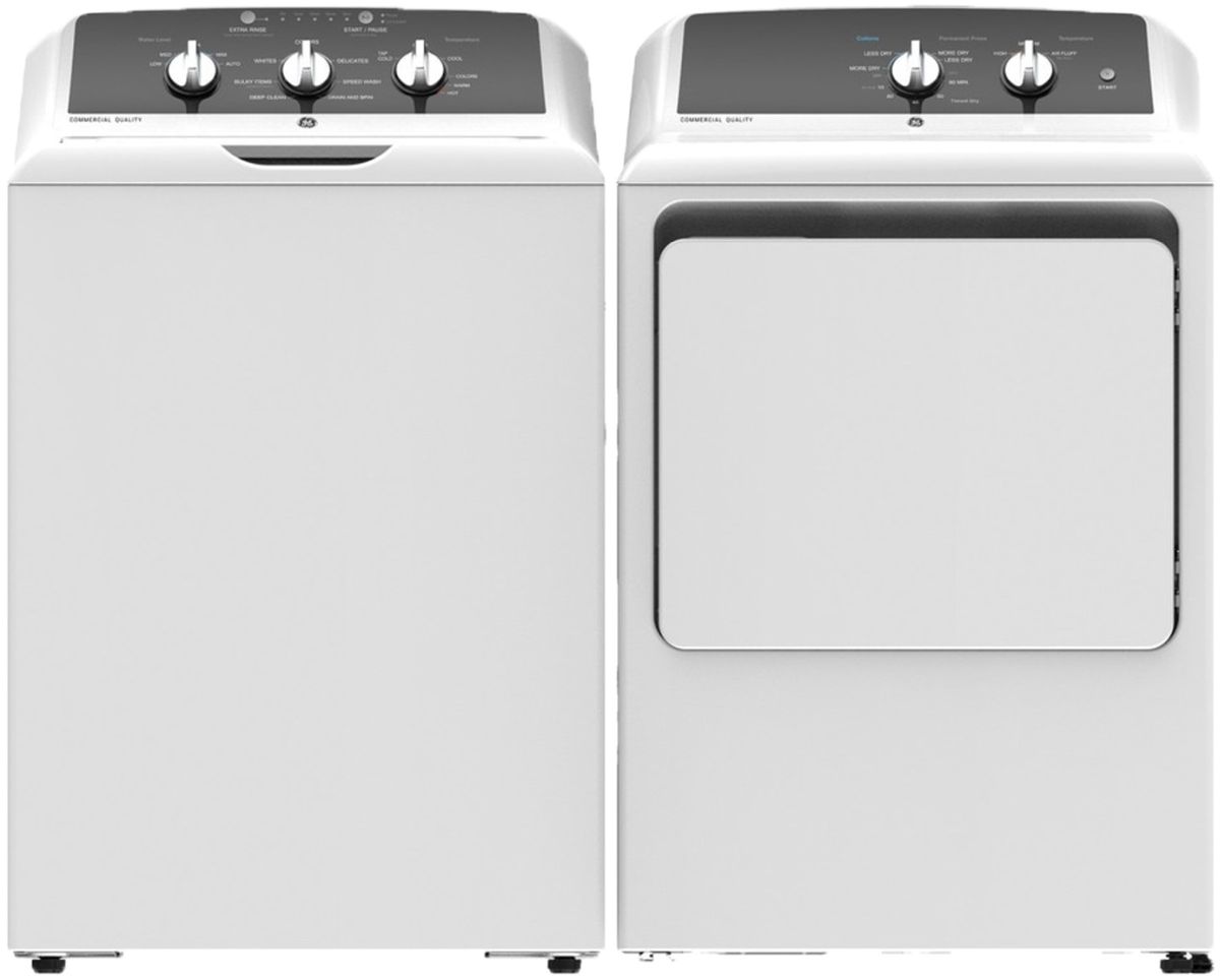 GE® White Laundry Pair with a 4.2 cu. ft. capacity top load washer and a 6.2 cu. ft. capacity front load electric dryer.Read More