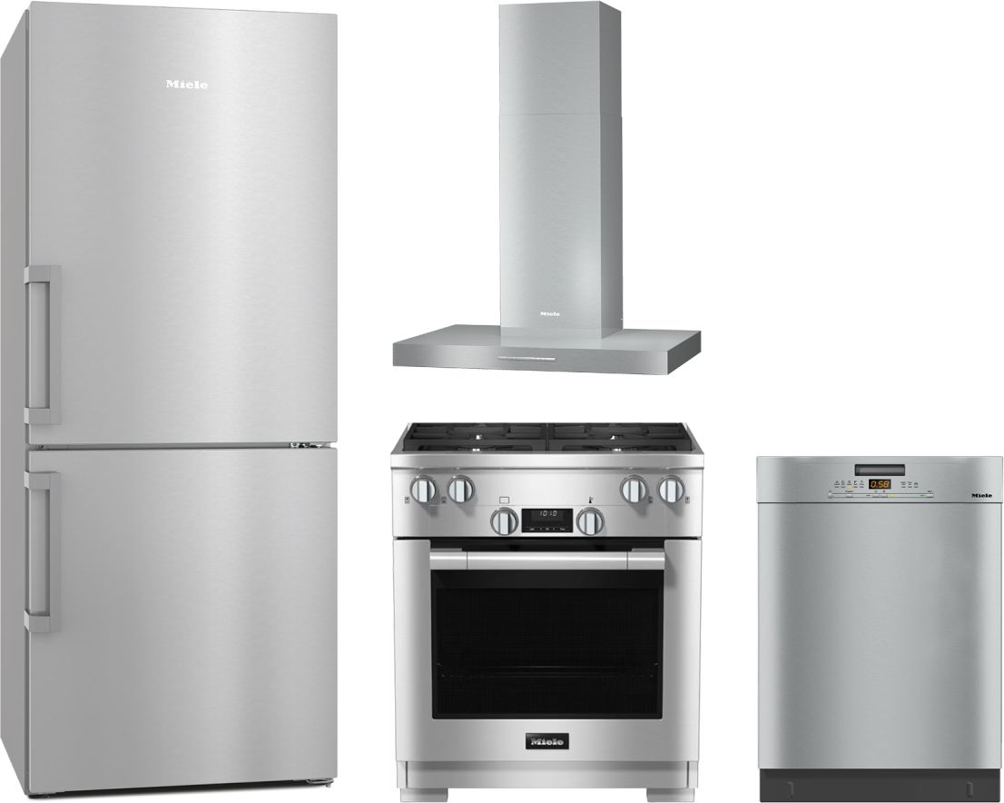 Miele 4 Piece Stainless Steel Kitchen Package with 30 in. Counter Depth Bottom Freezer Refrigerator, Built In Dishwasher, Pro Style Dual Fuel Range, and Wall Mounted Range HoodRead More