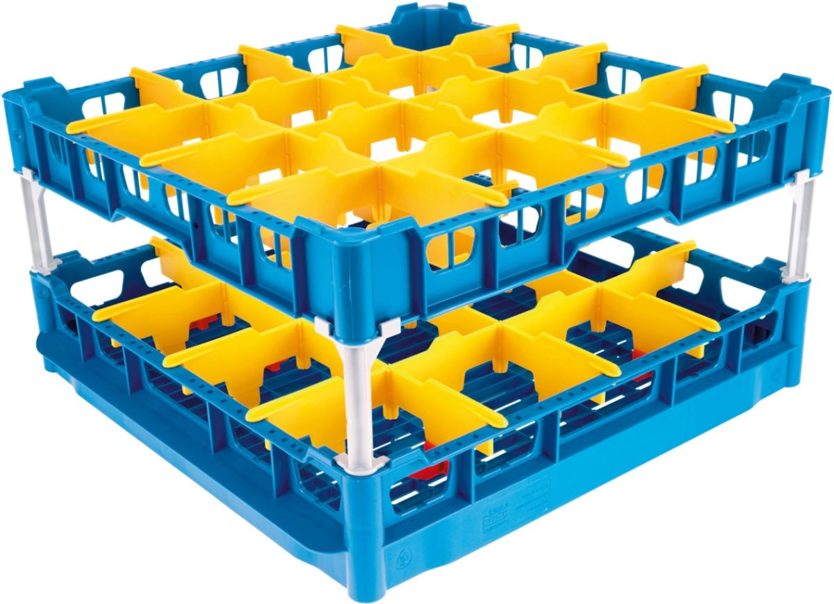 Basket with tilters for the improved washing and drying of 16 glasses.